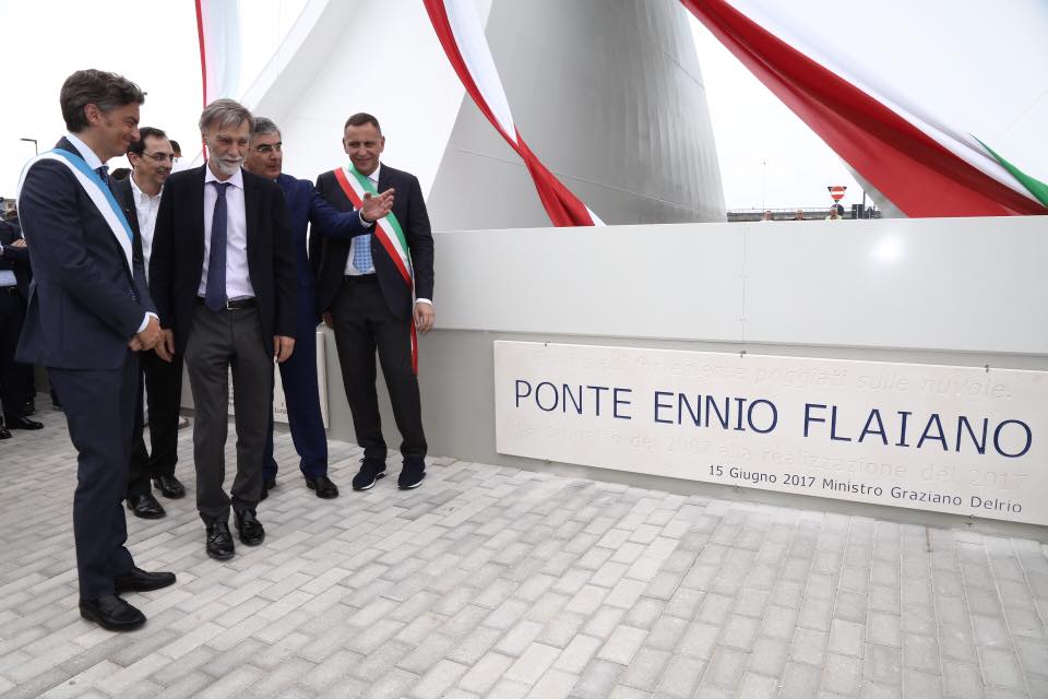 E’ arrivato in bicicletta, il ministro delle Infrastrutture, Graziano Delrio che, con il presidente della Regione Abruzzo, Luciano D’Alfonso, il sindaco di Pescara, Marco Alessandrini, e gli altri amministratori regionali e comunali, ha tenuto a battesimo il settimo ponte di pescara, dedicato al concittadino illustre, Ennio Flaiano. Grande festa in città con 400 bimbi delle scuole che culminerà, stasera, con il concerto gratuito dei Sud Sound System. Taglio del nastro, oggi, per il Ponte Flaiano che da domani, quando sarà aperto al traffico, collegherà l’Asse attrezzato, zona ex Camuzzi nella parte sud della città, al centro e alle aree di risulta. Un’opera attesa 40 anni, ha detto il presidente D’Alfonso che ha ringraziato tutte le amministrazioni che si sono susseguite e hanno seguito l’iter del ponte nuovo. Il ministro Delrio parla di una struttura utile che unirà le due parti della città ed è anche sostenibile per la presenza di due piste ciclabili. Non è mancato qualche malumore di cittadini che chiedono di intervenire sulle emergenze del territorio abruzzese ma a tal proposito, in Comune, Delrio e D’Alfonso hanno presentato il programma di realizzazione di opere pubbliche in Abruzzo e di potenziamento delle strutture preesistenti.
