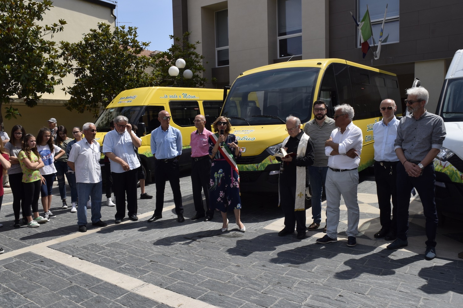 L’assessore all’Ambiente Angiolino Chiacchia ha ricordato come la scelta ambientale dell’Amministrazione comunale, nel quinquennio che sta terminando, si sia realizzata attraverso la mobilità sostenibile con l’acquisto per il Comando della Polizia Locale di due Fiat Panda alimentate a metano oltre alla dotazione di due biciclette elettriche senza dimenticare l’autobus elettrico per il trasporto pubblico. Il nuovo scuolabus è stato benedetto dal parroco della chiesa San Giuseppe, don Raimondo Artese. Erano presenti gli studenti di alcune classi della Scuola media “S. D’Acquisto” dell’Istituto Comprensivo n. 1.