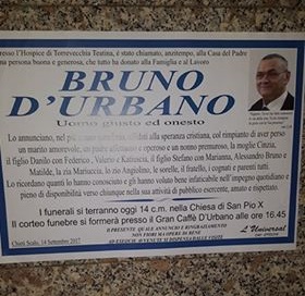 Il corteo funebre si formerà presso il Gran caffè D’Urbano alle ore 16,45. Bruno D’Urbano, viene ricordato in città come una persona buona e generosa sempre disponibile e con il sorriso sul volto. Padre esemplare e marito premuroso viene ricordato con affetto dai suoi familiari.