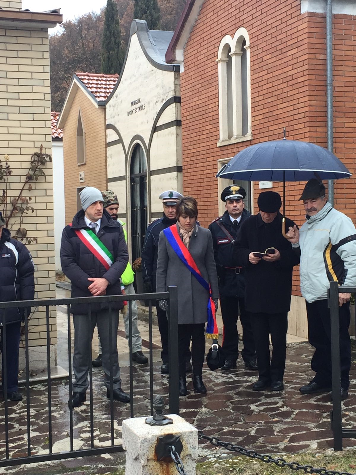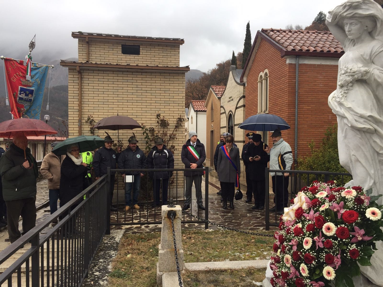 Il Sindaco Settimio Santilli e la Presidente del Consiglio comunale Lisa Carusi si sono recati, come da programma, al cimitero comunale dove è stata deposta una corona di fiori (recante la dicitura “Il Sindaco e l’Amministrazione comunale in ricordo delle vittime del 1915”) al monumento dedicato a Mariannina Letta la donna che rappresenta uno dei simboli delle vittime del terremoto. La giovane, promessa sposa morì sotto le macerie della sua abitazione alla vigilia delle nozze. Nino, il giovane notaio e violinista a ricordo di Mariannina fece scolpire una statua che riproduceva la sua giovane sposa con il braccio levato verso il cielo, mentre con la mano stringeva il lenzuolo nell’ultimo disperato gesto di sopravvivenza.
