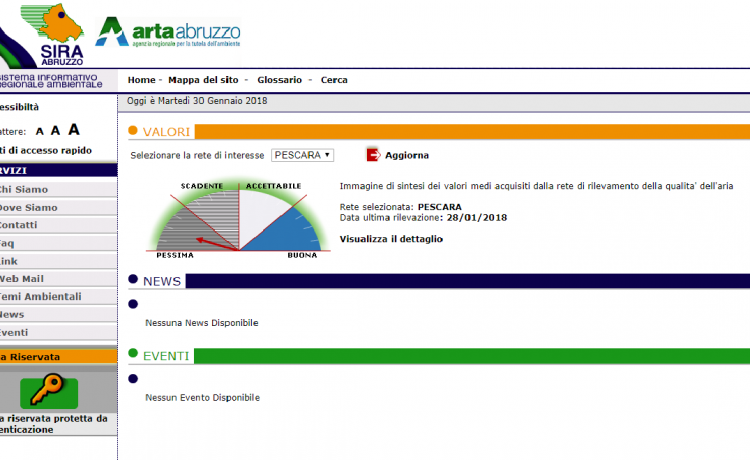 I valori relativi alla qualità dell’aria nella città di Pescara sono tutt’altro che buoni, come si evince consultando il sito dell’Arta. In particolare, per la giornata del 28 gennaio, l’aria è risultata “pessima” in 3 zone urbane: via Sacco, via Firenze e Teatro d’Annunzio. Ormai da qualche giorno le centraline di rilevamento registrano il superamento dei limiti consentiti del Pm10 e delle polveri sottili. In tutte e tre le aree indicate i superamenti si sono verificati già diverse volte dall’inizio dell’anno: 9 in via Sacco, 8 al Teatro d’Annunzio, 6 in via Firenze. Nella norma invece i valori relativi al benzene. Situazione nettamente migliore nelle altre città, “buona” e “accettabile” rispettivamente a L’Aquila e Chieti, mentre a Teramo, nel rilevamento del 25 gennaio, l’aria è stata definita “scadente”.
