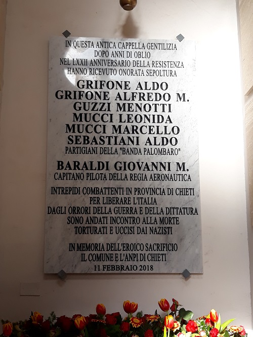 Il Sindaco di Chieti, Umberto Di Primio presso il Cimitero comunale, assieme ai rappresentanti dell’A.N.P.I. “Alfredo Grifone”, delle associazioni combattentistiche e dei parenti dei giovani martiri della Banda Palombaro, che nel periodo bellico dell’occupazione tedesca seguita all’armistizio dell’8 settembre 1943 furono fatti prigionieri e poi fucilati dai militari tedeschi, ha partecipato alla commemorazione dei caduti le cui spoglie sono state traslate all’interno della Cappella Taraborrelli, di proprietà comunale. Quest’ultima, dopo i lavori di straordinaria manutenzione fatti eseguire dall’Amministrazione comunale, è tornata ad ospitare Alfredo e Aldo Grifone, Menotti Guzzi, Leonida Mucci, Marcello Mucci, Aldo Sebastiani e il capitano della Regia Aviazione Militare, Giovanni Baraldi, divenendo il Sacrario dei Combattenti della Resistenza teatina a perenne ricordo del loro sacrificio.