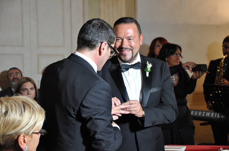 Circondati da tanti amici, dai parenti e anche da tanti cittadini semplici hanno finalmente coronato una vita insieme: nel municipio di Atri è stata celebrata l’unione civile fra lo stilista teramano Filippo Flocco e l’imprenditore atriano Carmine Pavone. È stato il sindaco Gabriele Astolfi a dare esecuzione al decreto attuativo della legge Cirinnà: “Oggi ad Atri si celebra un diritto civile e per questo sono molto emozionato- ha detto il primo cittadino. Filippo e Carmine, entrambi elegantissimi in smoking con camicia bianca, hanno ascoltato il sindaco dare lettura degli articoli della legge Cirinnà. Quando è arrivato il momento di pronunciare tutta la commozione della coppia: il sì di Filippo è stato d’impeto, senza il microfono per poter essere ascoltato dagli altri presenti, mentre Carmine ha pronunciato un commosso “certamente”. Dopo il fatidico “dichiaro che Filippo e Carmine sono uniti civilmente” lo scambio degli anelli e un lungo l’applauso dei presenti.