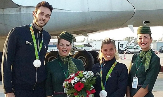 Due “argenti” olimpici festeggiati oggi a Fiumicino. Sono Francesca Dallapè, argento con Tania Cagnotto nel sincro tuffi, e l’abruzzese Paolo Nicolai che con Daniele Lupo, portabandiera azzurro domani nella cerimonia di chiusura, è salito sul secondo storico gradino del podio del beach volley. Questa mattina per i due atleti, medaglia d’argento ben in vista al collo, in compagnia di Matteo Varnier, l’allenatore della coppia Lupo-Nicolai, il rientro allo scalo romano da Rio de Janeiro, accolti festosamente dal personale Alitalia già sotto bordo dell’aereo. Per la tuffatrice, con la “mise” casual delle infradito ai piedi sotto la tuta della spedizione azzurra, l’omaggio floreale bordato di tricolore. Prima di raggiungere le rispettive destinazioni, per Paolo c’è l’attesa di mamma e papà ad Ortona, per i due medagliati anche tante foto ricordo col personale Alitalia ed aeroportuale ed alcuni passeggeri.