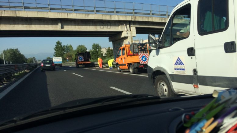 Il traffico è quello di punta delle 8 del mattino, le corsie sono già rallentate dai nuovi limiti e dai soliti imbranati quando vedi spuntare all’improvviso una bandiera arancione a segnalare mezzi dell’Anas in sosta.