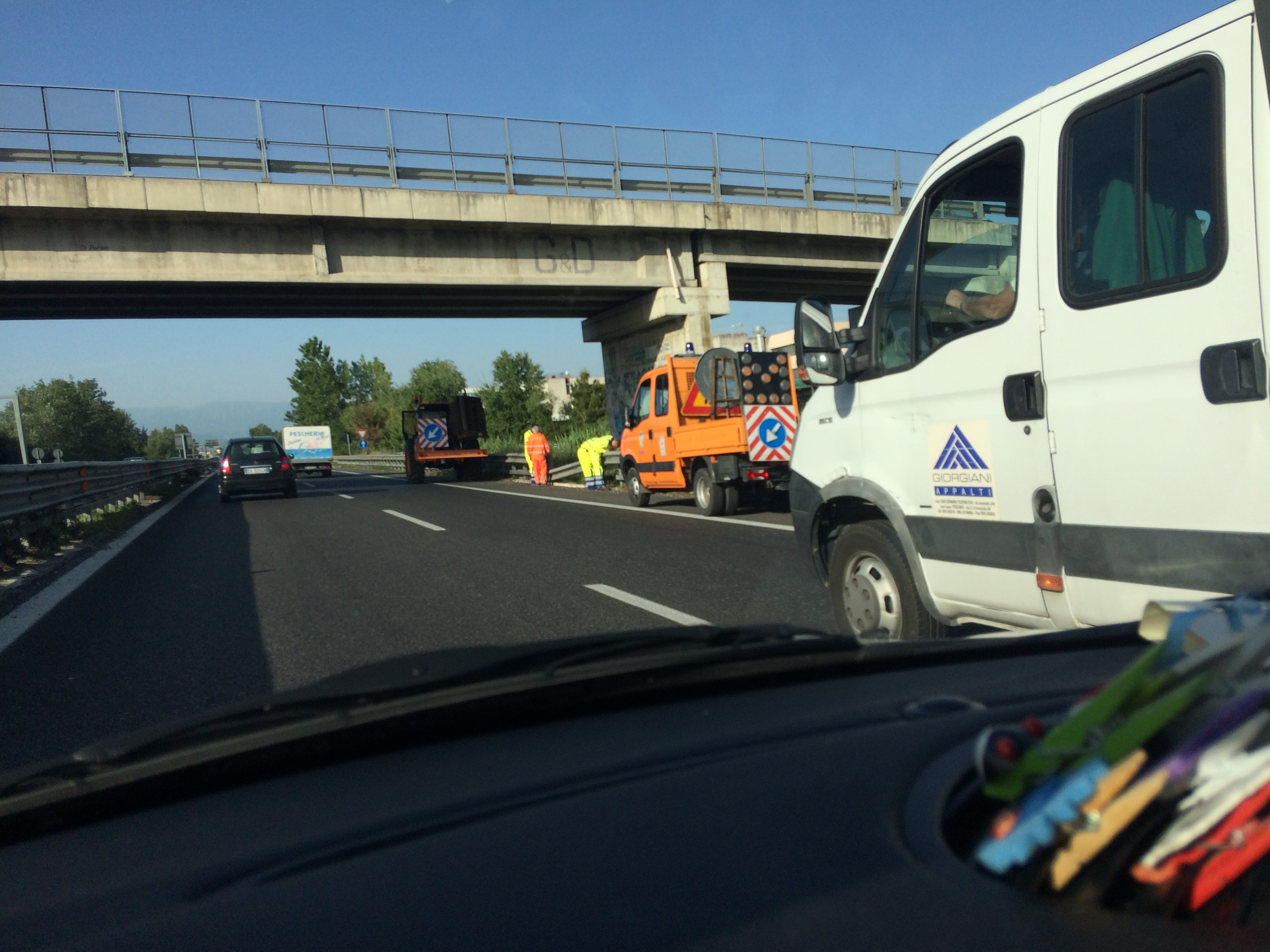 Il traffico è quello di punta delle 8 del mattino, le corsie sono già rallentate dai nuovi limiti e dai soliti imbranati quando vedi spuntare all’improvviso una bandiera arancione a segnalare mezzi dell’Anas in sosta.