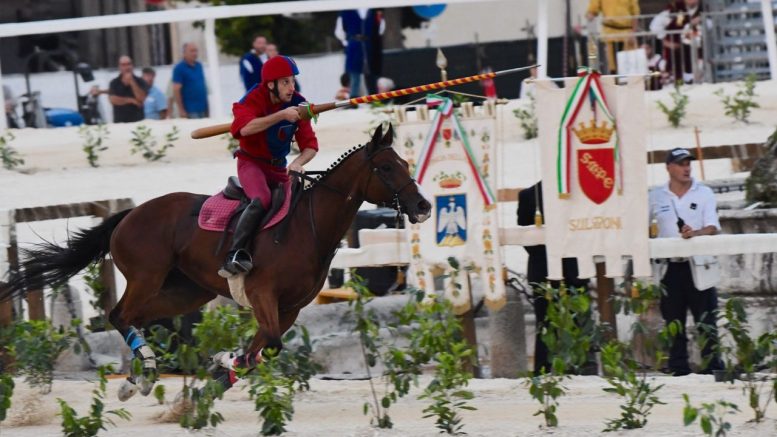 Facile immaginare quanto abbiano potuto patire il caldo i figuranti della suggestiva Giostra Cavalleresca di Sulmona in abiti dell’epoca rigorosamente in velluto e doppi, tripli, strati. In una giornata come quella di ieri, caldissima anche a Sulmona, non sono mancati, infatti, svenimenti e malori tra figuranti e turisti in piazza ad attendere corteo e prime gare. Dopo un paio di ore di soccorsi, tuttavia, la Giostra è entrata nel vivo. La corsa al Palio e a Manaresca é iniziata, ma i rossoblù corrono più veloci di tutti e nella prima giornata di gara sono davanti a tutti nella classifica generale. A guidare il corteo il Borgo che l’anno scorso ha chiuso all’ultimo posto, e a chiuderlo i detentori del Palio che hanno fatto il saluto alla Signora di Sulmona al momento dell’entrata in Piazza Garibaldi. Applausi per il Borgo San Panfilo, che ha messo in scena la coppia arrivata seconda ai campionati nazionali Tenzone Argentea lo scorso week end con Filippo Ficorilli e Michael Gasbarro. Durante le gare è stato premiato dal Commissario Reggente,Maurizio Antonini, e il Presidente della Giostra, Domenico Taglieri, Anthony Peth, ambasciatore del Made in Italy nel mondo.
