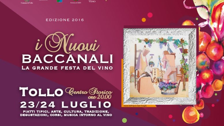 Anche quest’anno il Comune di Tollo punta sul vino per promuovere il proprio territorio. Si terrà, infatti, dal 23 al 24 luglio prossimi, “I Nuovi Baccanali“, un evento per valorizzare le tipicità del territorio. Oltre alla buona tavola e al buon vino ci saranno anche momenti dedicati all’approfondimento, come convegni e mini-corsi di degustazione a cura dell’Onav e dell'”Associazione tollese delle vite e del vino”. Inoltre, tra le vie del paese, oltre agli stand eno-gastronomici, si potrà assistere ad eventi culturali come l’originale concorso d’arte “Bottarte”, eventi di poesia, letteratura e cinema. E poi ancora, a partire dalle ore 21.30 tutte le sere nelle 2 piazze Piazza della Liberazione e Piazza Caduti di Nassirya si potrà ballare e ascoltare musica.