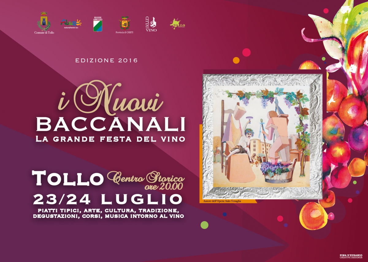 Anche quest’anno il Comune di Tollo punta sul vino per promuovere il proprio territorio. Si terrà, infatti, dal 23 al 24 luglio prossimi, “I Nuovi Baccanali“, un evento per valorizzare le tipicità del territorio. Oltre alla buona tavola e al buon vino ci saranno anche momenti dedicati all’approfondimento, come convegni e mini-corsi di degustazione a cura dell’Onav e dell'”Associazione tollese delle vite e del vino”. Inoltre, tra le vie del paese, oltre agli stand eno-gastronomici, si potrà assistere ad eventi culturali come l’originale concorso d’arte “Bottarte”, eventi di poesia, letteratura e cinema. E poi ancora, a partire dalle ore 21.30 tutte le sere nelle 2 piazze Piazza della Liberazione e Piazza Caduti di Nassirya si potrà ballare e ascoltare musica.