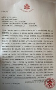 In un messaggio a firma del cardinale segretario di Stato Pietro Parolin e indirizzato al ministro Antonio Tajani, il Papa incoraggia i presenti “a perseverare nella promozione di una cultura dell’incontro, aperta al dialogo rispettoso, quali veri testimoni del Vangelo vivente della carità”. Esprime inoltre il suo apprezzamento per l’incontro, auspicando che possa “favorire uno scambio di esperienze sull’impegno sociale ed educativo di coloro che operano in prima persona nel continente africano”