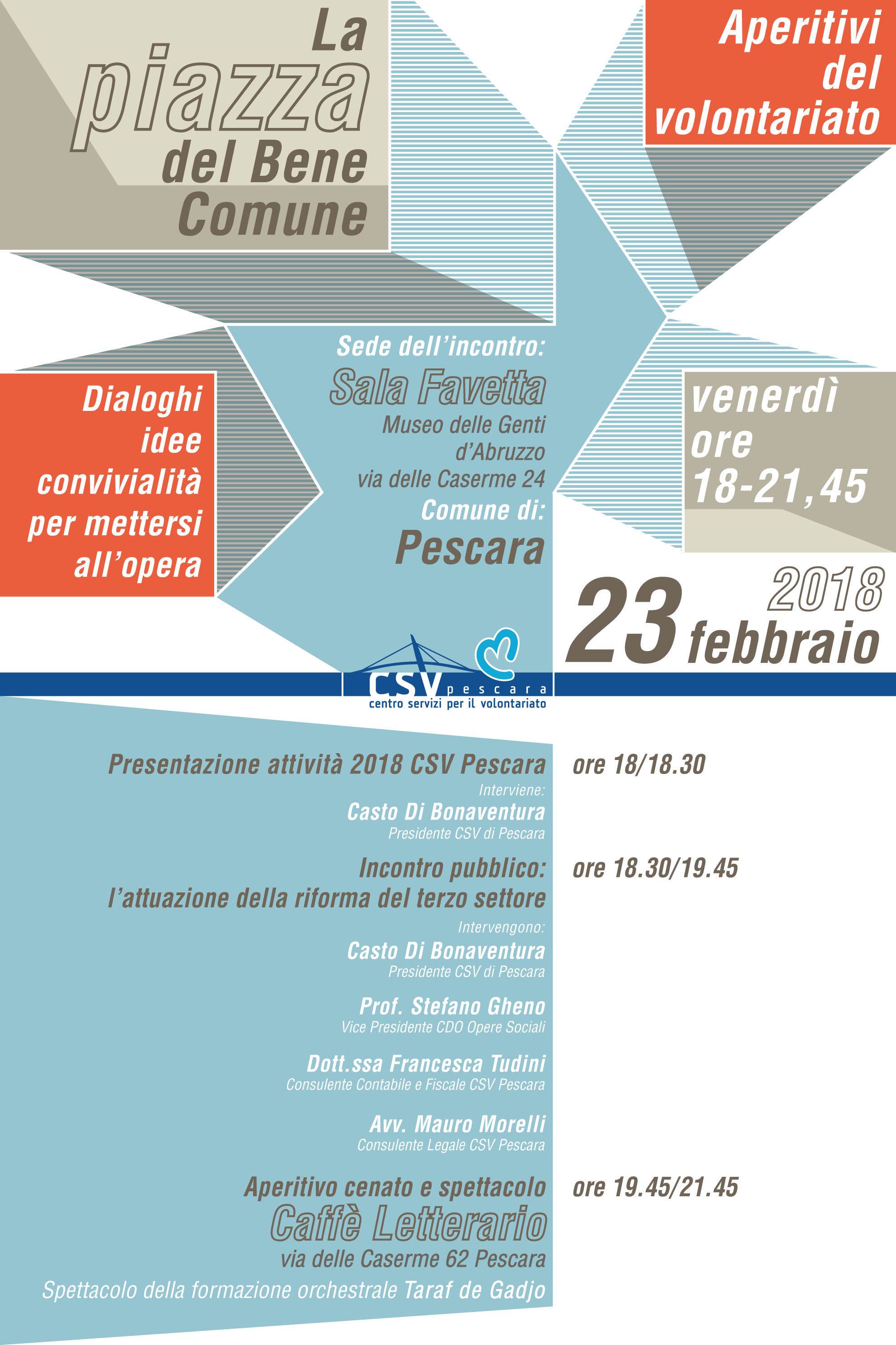 Questa giornata, spiegano dal CSV, Centro Servizi per il Volontariato, prosegue il dialogo aperto un anno fa, il 3 febbraio, incentrato sul bene comune e che si muove da una semplice domanda: è possibile costruire una comunità più solidale? Questa domanda ha suscitato l’interesse di chi ogni giorno lavora a questo scopo, che guarda la realtà che ci circonda e che ogni giorno si mette all’opera all’interno del proprio contesto. Ora è il momento di rilanciare il dibattito con altre domande: è possibile intravedere un di più per il mondo del Terzo Settore? Cosa è richiesto dalle norme e che cosa si dovrà modificare nelle associazioni? A queste e altre domande si vuole cercare risposta il prossimo 23 febbraio, presso la sala Favetta del Museo delle Genti d’Abruzzo a Pescara.