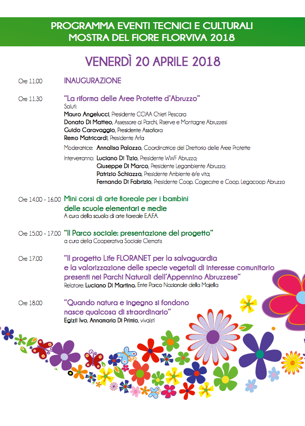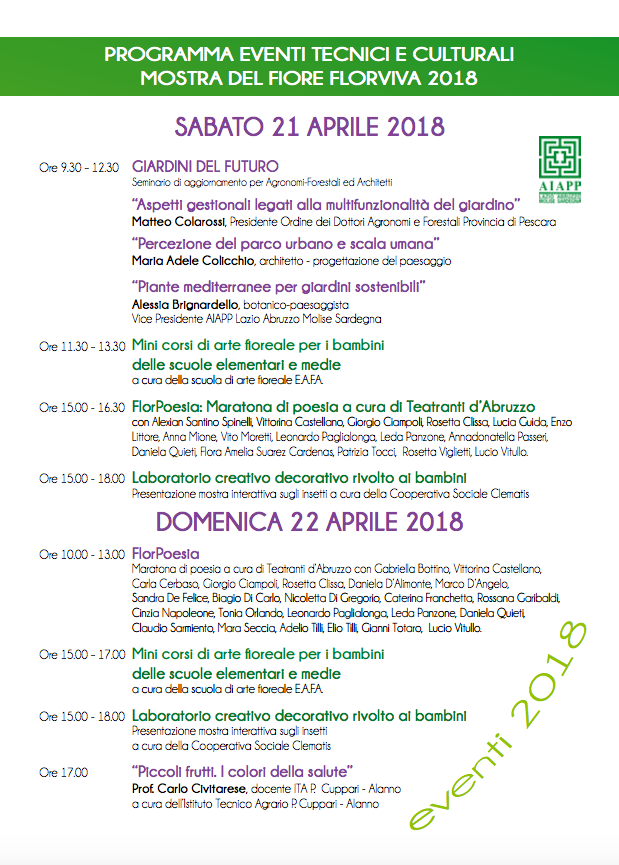 Mostra del Fiore – Florviva (ingresso gratuito) è una manifestazione che unisce ormai da sette anni in una sinergia vincente i due appuntamenti più importanti relativi alla floricultura in Abruzzo, realizzando un evento che negli anni scorsi ha fatto registrare oltre 70 mila presenze all’anno, coinvolgendo produttori di 15 regioni italiane ed espositori di 20 Paesi nel mondo. Oltre 200 gli espositori.