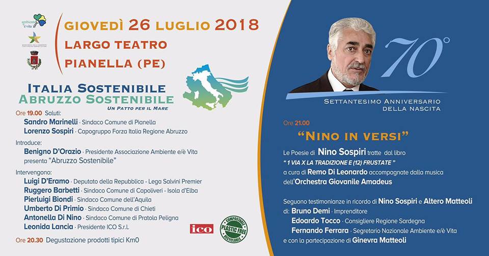 “In quella occasione abbiamo illustrato il nostro progetto ITALIA SOSTENIBILE, idee ed azioni per l’Italia; a Pianella illustreremo il progetto e la sua ‘declinazione’ per l’Abruzzo: un decalogo di idee ed azioni per rendere la nostra regione ‘a caratterizzazione ambientale’ in grado cioe’ di svilupparsi in modo sostenibile ed innovativo”, dichiara il presidente Benigno D’Orazio. Insomma un ricordo del fondatore e del presidente di Ambiente e/e’ Vita ma anche idee e progetti per il futuro in linea con i principi fondanti dell’associazione; di questo discuteranno i relatori di Pianella: Sandro Marinelli, Lorenzo Sospiri, Benigno D’Orazio, Luigi D’Eramo, Ruggero Barbetti, Pierluigi Biondi, Umberto Di Primio, Antonella Di Nino, Leonida Lancia (presidente della Ico srl grazie alla quale l’evento sara’ ‘plastic free’). La manifestazione, dopo la degustazione di prodotti a km 0, proseguira’ con le poesie di Nino Sospiri a cura di Remo Di Leonardo e con l’esibizione dell’orchestra giovanile Amadeus di Pescara; infine il ricordo di Sospiri e Matteoli con Bruno Demi, Edoardo Tocco, Fernando Ferrara e Ginevra Matteoli. Ha gia’ assicurato la partecipazione alla manifestazione l’on. Alessandra Mussolini, oltre a tanti amministratori e rappresentanti delle istituzioni che saranno presenti all’iniziativa. L’associazione esprime sin d’ora un sentito ringraziamento a Lorenzo Sospiri ed al sindaco di Pianella Sandro Marinelli che hanno reso possibile la realizzazione della manifestazione”.