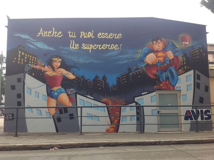 “Diventa anche tu un supereroe”, l’appello lanciato dall’Avis provinciale di Pescara attraverso un murales che campeggia sulla parete della scuola Fanny Di Blasio di Montesilvano, lungo via San Pietro.