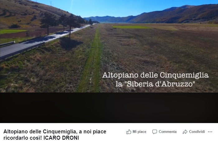 “L’Altopiano delle Cinquemiglia si estende per circa 9 km in lunghezza ed 1 km in larghezza. E’ attraversato dalla Strada statale 17, dell’Appennino Abruzzese e Appulo Sannitica, che fino ad ottobre 2018 era delimitata da magnifici PINI NERI. Completamente disabitato e spoglio di vegetazione, è animato nella buona stagione da greggi e mandrie e frequentato dai turisti, mentre d’inverno per inversione termica fa spesso registrare temperature minime quasi da record per l’Appennino; talvolta infatti, nelle nottate invernali con cielo sereno e calma di vento, si possono raggiungere temperature fino a -30 °C, portandolo per questo ad etichettarlo come la ‘Siberia del Mediterraneo'”.