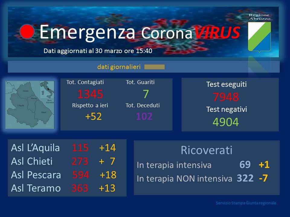 Del totale dei casi positivi, 115 si riferiscono alla Asl Avezzano-Sulmona-L’Aquila, 273 alla Asl Lanciano-Vasto-Chieti, 594 alla Asl di Pescara e 363 alla Asl di Teramo.