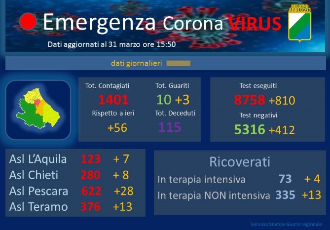 In Abruzzo, dall’inizio dell’emergenza, sono stati registrati 1.401 casi positivi al Covid 19, diagnosticati dai test eseguiti nel laboratorio di riferimento regionale di Pescara, anche attraverso l’Istituto Zooprofilattico di Teramo. Rispetto a ieri si registra un aumento di 56 nuovi casi. Salgono a 115 i pazienti deceduti.