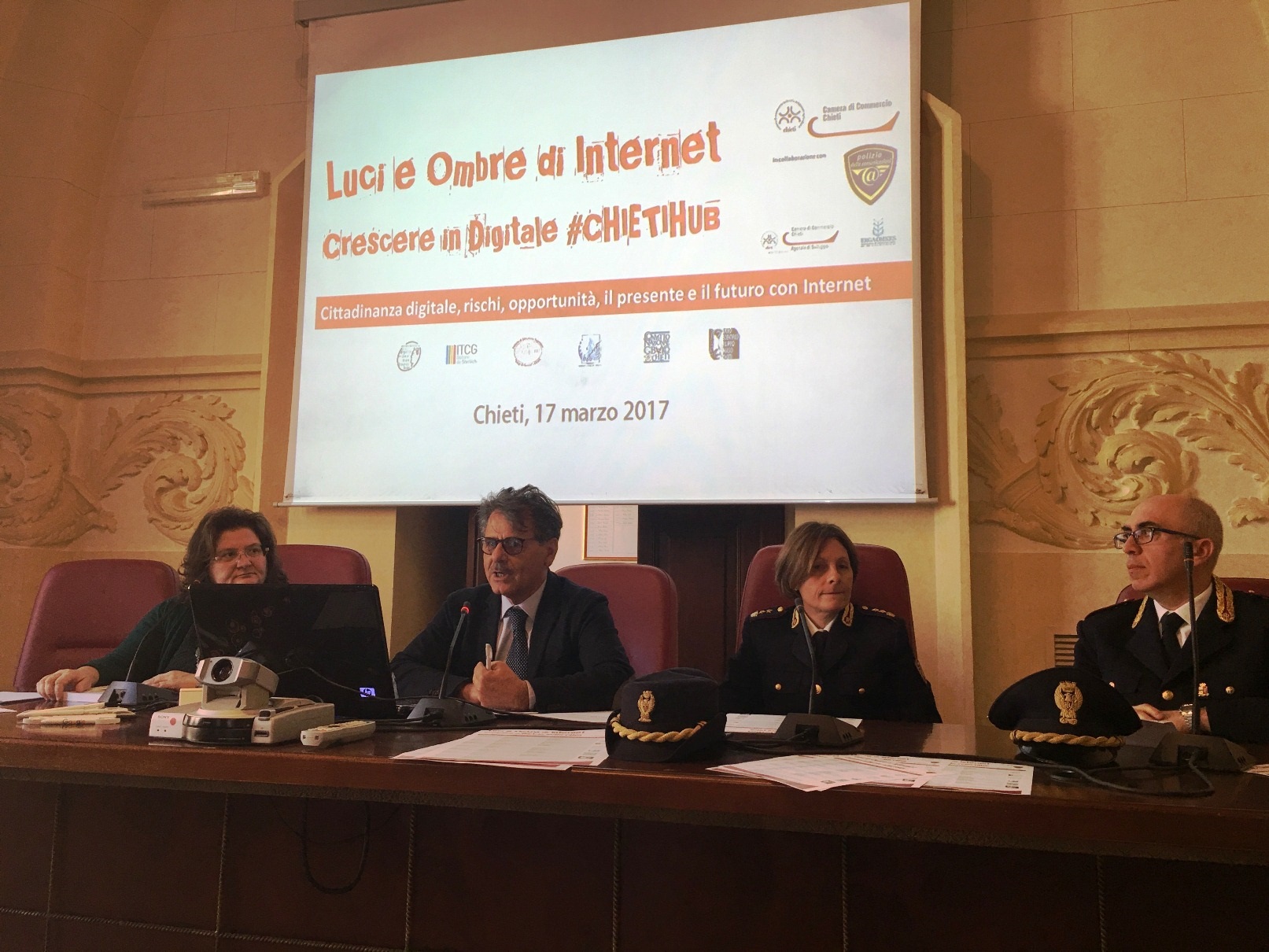 Quattrocento in totale gli studenti che hanno preso parte ad un ciclo d’ incontri nei rispettivi istituti con psicologi, sociologi, esponenti della polizia postale, esperti di economia digitale e giornalisti sui vari aspetti del mondo di internet, da quello patologico dell’abuso e della dipendenza, a quello delle opportunità per il lavoro, l’impresa e la comunicazione. Si è discusso, inoltre, di come riconoscere le notizie bufale sui social media ma anche dei segreti dei motori di ricerca, di industria 4.0, di come e perché fare e-commerce. L’Abruzzo e l’Italia in più in generale, ha sottolineato Paola Sabella, Segretario Generale della Camera di Commercio di Chieti, è ancora molto indietro rispetto alle nuove opportunità commerciali e professionali che le nuove frontiere di internet offrono. Grazie ad iniziative come queste si stanno creando opportunità concrete di lavoro. All’incontro, hanno preso parte con il Presidente della Camera di Commercio di Chieti, Roberto Di Vincenzo, anche Elisabetta Narcisi Dirigente del Compartimento di Polizia Postale e delle Comunicazioni di Pescara, Giuseppe Lavenia, psicologo clinico-psicosomatista e docente di Psicologia evolutiva all’Università G. D’Annunzio, vice presidente dell’Ordine degli Psicologi delle Marche, Raffaele Bonanni, professore straordinario diritto del lavoro – Universitas Mercatorum, presidente ANSI – Associazione Nazionale Scuola Italiana, Cesidio Borrelli, Advisor start up accreditato Luiss ENLAB, Paola Sabella, Segretario Generale Camera di Commercio di Chieti, Angela Rossi, Docente Sociologia dell’Educazione Istituto Toniolo, Gianluca De Santis, Responsabile progetto Crescere in Digitale – Camera di Commercio di Chieti e una rappresentanza dei docenti e studenti degli istituti scolastici coinvolti: Liceo Classico – Istituto d’Arte “G.B.Vico”, Liceo Scientifico “F. Masci”, Liceo Statale Linguistico “Isabella Gonzaga”, Istituto di Istruzione Superiore “Luigi Di Savoia”, Istituto Tecnico Commerciale e per Geometri “Galiani – de Sterlich”, Istituto di Istruzione Superiore “U. Pomilio”.