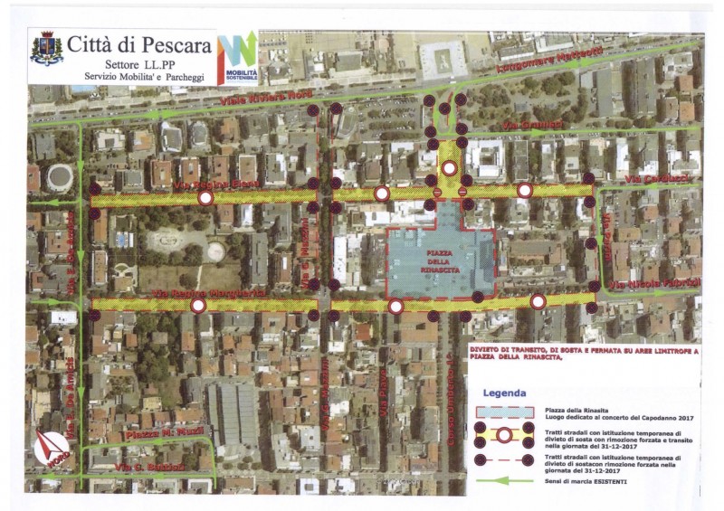 • Istituzione del divieto di sosta e di fermata con rimozione forzata (ad eccezione dei mezzi di supporto della manifestazione) su piazza della Rinascita lato mare per il tratto stradale compreso tra via Carducci e l’innesto di viale regina Elena;