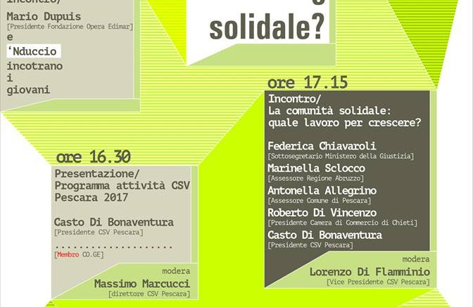 “Lo sviluppo di una comunità solidale – si legge nella nota del CSV – è il risultato dell’impegno sinergico di pubblico, profit, non profit e cittadini. Quale ruolo spetti a ognuno è il terzo spunto di riflessione dell’evento organizzato dal CSV di Pescara in collaborazione con il CO.GE. Abruzzo. L’associazionismo, l’imprenditoria, la scuola sono chiamati a collaborare in un processo di sviluppo della collettività da svolgere in stretta collaborazione con lo Stato e gli enti locali. Un lavoro sinergico e coordinato tra le componenti fondamentali della comunità, infatti, si rivela necessario per raggiungere obiettivi comuni di crescita solidale, ma spesso questa unione non avviene. Perché? Forse manca uno slancio di fiducia reciproca o una predisposizione culturale a lavorare insieme, alla pari, per raggiungere un obiettivo comune. Ma quale tipo di rapporto di fiducia serve e perché è così vitale per far crescere la collettività? Lavoriamoci insieme!”