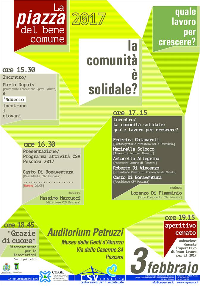 Il Centro Servizi per il Volontariato di Pescara, in collaborazione con il CO.GE. Abruzzo, ha organizzato per venerdì 3 febbraio “La Piazza del Bene Comune” che si terrà presso l’Auditorium Petruzzi. L’evento, presentato oggi, è aperto a tutta la cittadinanza e rappresenta un’occasione di incontro e confronto sui temi della comunità solidale, sull’utilizzo delle reti e sull’impegno necessario per far crescere la cittadinanza. Alla conferenza stampa di presentazione sono stati invitati Antonio Di Marco, presidente della Provincia di Pescara, Marco Alessandrini, sindaco di Pescara, Antonella Allegrino, assessore alle Politiche sociali del Comune di Pescara, Carla Di Santo Panzino, presidente del CO.GE. Abruzzo, Casto di Bonaventura, presidente del CSV di Pescara.