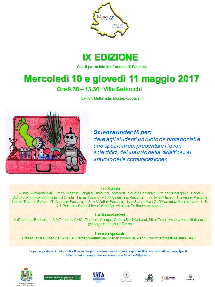 “Scienza under 18, nata nel 1997 a Milano e arrivata a Pescara nel 2008, è stata ideata per dare agli studenti un ruolo da protagonisti e uno spazio in cui poter comunicare i lavori scientifici (tavolo della comunicazione) realizzati a scuola (tavolo della didattica) nel corso dell’anno scolastico. Su18 si fonda sulla convinzione che la scienza sia “sapere comunicato” e che occorra quindi dare spazio “scientifico” agli studenti, per consentire loro di condividere diverse esperienze e di incontrare alunni e docenti di altre scuole. La manifestazione che chiude il ciclo annuale si tiene nel mese di maggio in tutte le sedi nazionali e rappresenta un originale viaggio nell’universo delle tematiche scientifiche. Ogni anno si rinnova la preziosa collaborazione con le scuole che propongono laboratori didattici ideati e spiegati dagli stessi studenti. I progetti vengono presentati secondo diverse modalità: exhibit, mostre interattive, multimedia, fotografia scientifica, robotica, pensiero computazionale. Inoltre, per il giornalismo scientifico, viene dato ampio spazio alle tematiche inerenti la salute della Terra, una delle mission fondamentali di Su18 Pescara. Quest’anno dedicheremo un evento speciale alla memoria di Gianni Cordova , fondatore della LAAD e grande sostenitore di Su18, il cui lavoro prezioso viene proseguito dagli operatori, dalla moglie e dalla figlia. Tra le altre iniziative in programma ricordiamo Scatti di Scienza, in collaborazione con l’Università di Milano, che quest’anno avrà una valenza speciale: l’Abruzzo infatti avrà uno spazio proprio nell’ambito dell’evento internazionale Fascination of Plants Day 2017 (Giornata del fascino delle piante). L’Orto Botanico di Brera dell’Università degli Studi di Milano accoglierà, dal 15 al 21 maggio, una mostra di Scatti di Scienza (fotografie di studenti su temi legati alla natura) tra gli eventi della Giornata del fascino delle piante. La partecipazione è aperta a studenti di qualunque luogo, ma a Milano hanno pensato di dedicare una sezione proprio ai lavori degli studenti dell’Abruzzo, alla loro sensibilità verso la natura della regione. Come organizzazione di Scienza under 18, desideriamo ringraziare il sindaco di Pescara Marco Alessandrini, gli assessori Giacomo Cuzzi e il vice sindaco Antonio Blasioli, oltre a tutti coloro che credono nell’iniziativa e la sostengono attivamente, ai tanti volontari, gli studenti e i docenti”.