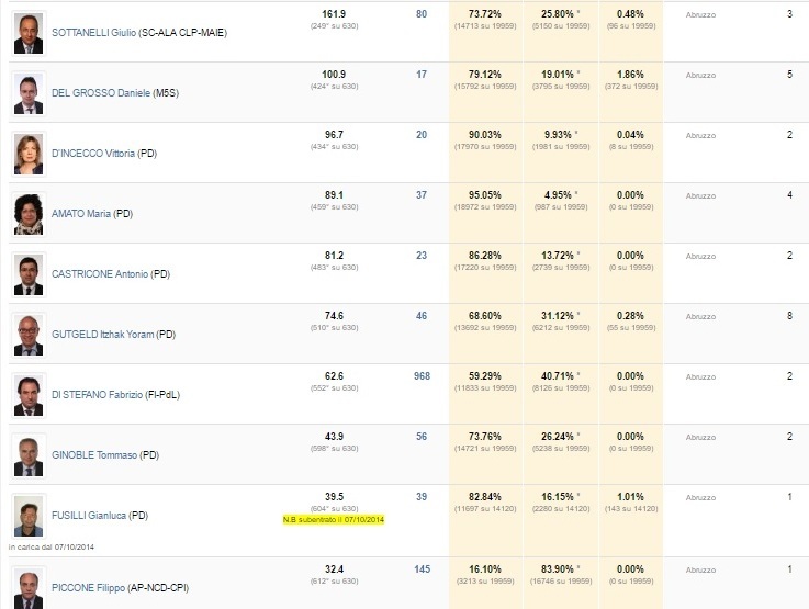 Al secondo posto per la produttività Andrea Colletti, del M5S, e Maria Amato, del Pd, per le presenze. I dati emergono consultando il sito Open Parlamento (http://parlamento17.openpolis.it) che riporta fedelmente le informazioni relative alle presenze e all’indice di produttività di tutti i parlamentari, dall’inizio della legislatura (marzo 2013) fino alla data dell’ultimo aggiornamento, a chiusura dell’anno 2016. Tra i deputati abruzzesi, Gianni Melilla ha concluso il 2016 con il primato di maggior presenze in Parlamento: 99.29%, per un totale di 19.817 su 19.959 votazioni. Relativamente alla produttività, i parametri sono tarati sulla quantità e sull’efficacia dell’attività realizzata dai parlamentari. In particolare, le graduatorie tengono conto di numero, tipologia, consenso e iter degli atti presentati. Melilla figura al primo posto con un indice di 556.4 (che comprende 232 disegni di legge, 133 interpellanze, 138 interrogazioni a risposta orale e 542 a risposta scritta come primo e co-firmatario).