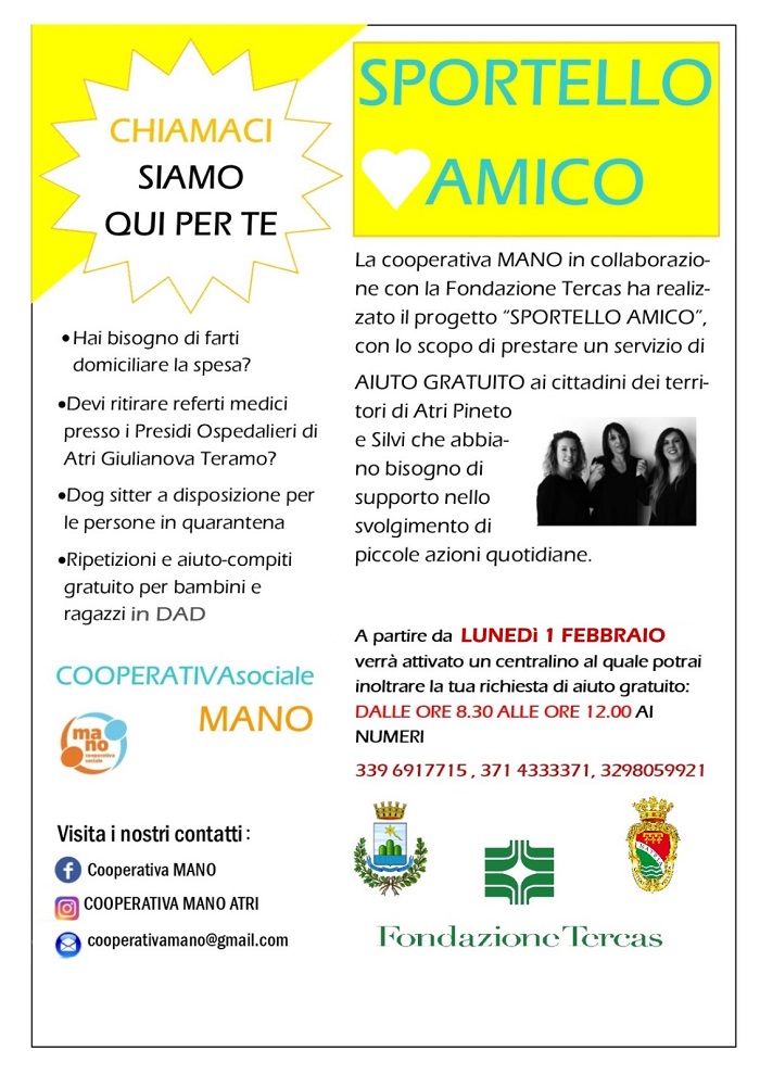 Ritiro referti medici nei presidi ospedalieri di Atri, Teramo o Giulianova, dog sitter a disposizione di persone in quarantena, consegna della spesa a domicilio e ripetizioni e aiuto-compiti gratuito per bambini e ragazzi in didattica a distanza. Sono questi alcuni dei servizi che verranno offerti dal primo febbraio 2021 dalla Cooperativa Sociale Mano di Atri, che in collaborazione con la Fondazione Tercas e con il patrocinio di Comuni di Atri e Pineto, ha dato vita allo “Sportello Amico”. Si tratta di un servizio cui potranno rivolgersi gratuitamente i cittadini dei territori di Atri, Pineto e Silvi che abbiano bisogno di un supporto nello svolgimento di queste e altre piccole azioni quotidiane. Dal primo febbraio e per circa due mesi saranno attivi i numeri telefonici 339.6917715, 371.4333371, 329.8059921 da contattare per inoltrare la richiesta di aiuto gratuito dalle 8,30 alle 12 dal lunedì al venerdì.