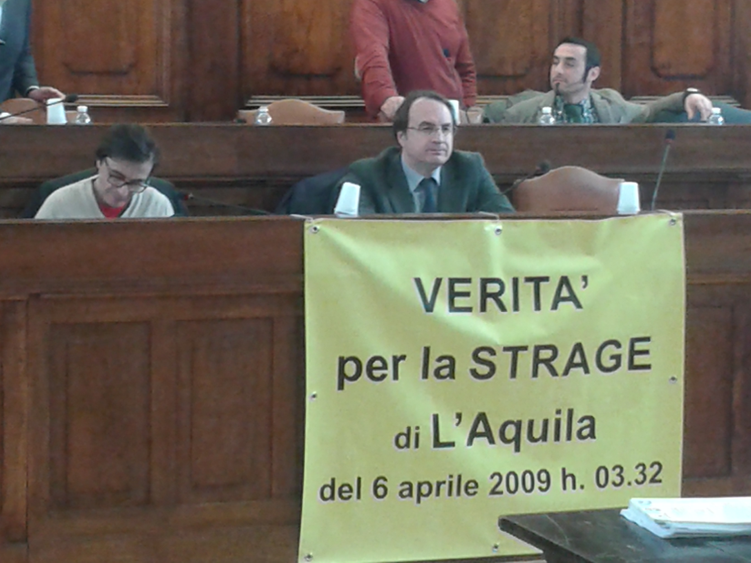 “Verità sulla strage dell’Aquila del 6 aprile 2009”: sono le parole riportate su uno striscione che il consigliere comunale di “Appello per L’Aquila che vogliamo”, Vincenzo Vittorini, ha esposto questa mattina in consiglio comunale.