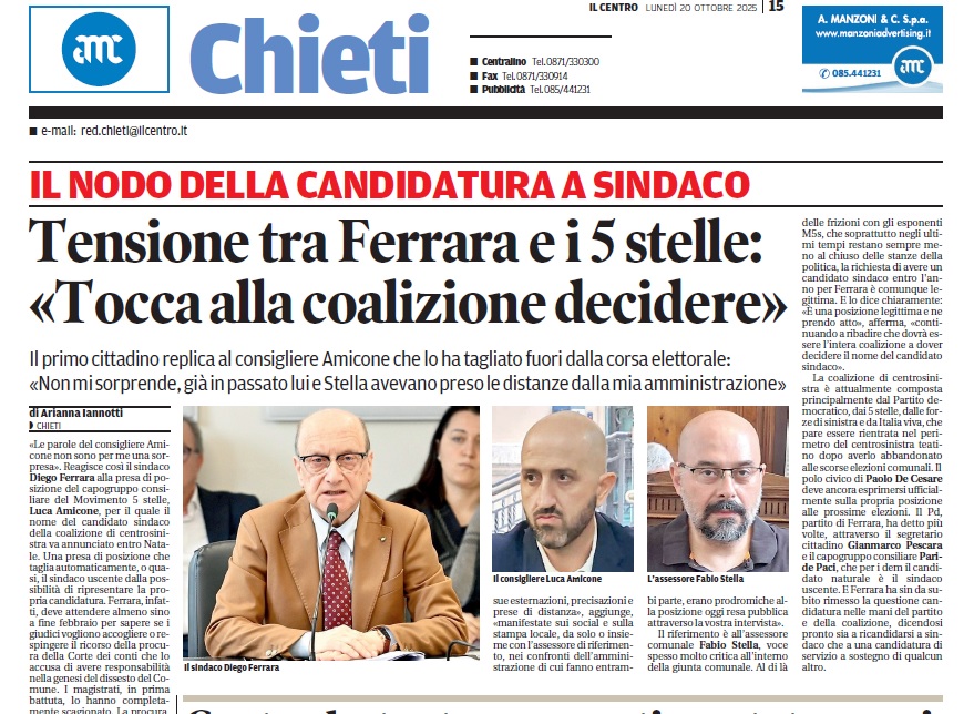 Ieri sulle pagine del Centro, nell’articolo di Arianna Iannotti, il M5S riferiva di dare uno stop a Ferrara quale candidato sindaco bis per le prossime Comunali.