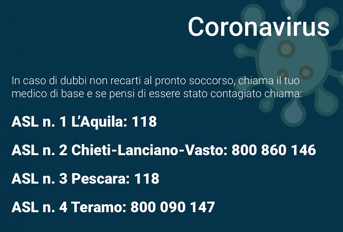 Sul nuovo Coronavirus, la Regione Abruzzo ha già attivato tutte le misure stabilite dal Ministero della Salute, in stretto raccordo con le Aziende sanitarie. Di seguito in numeri utili da contattare delle Asl oltre al 1500.