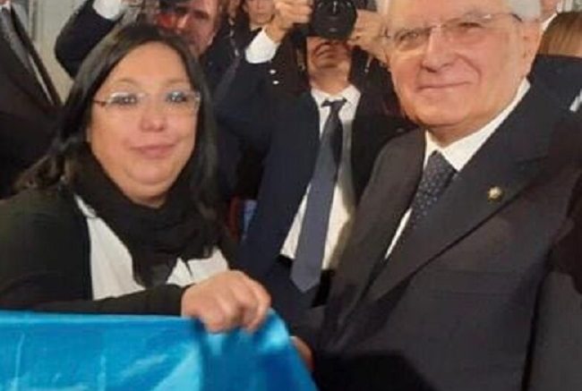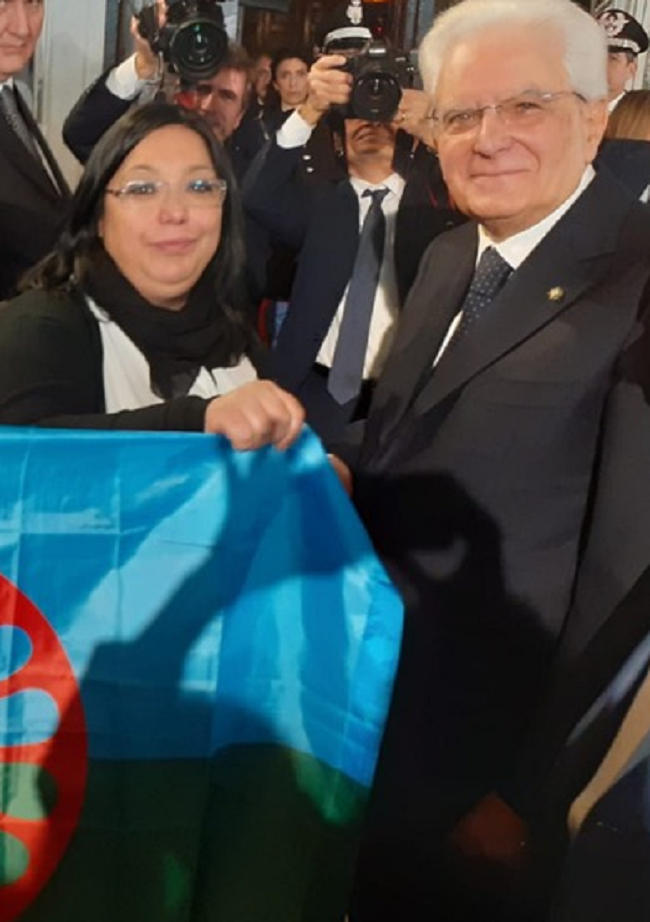 Ieri 27 gennaio a Roma, durante la celebrazione della giornata della memoria al Quirinale, Giulia Di Rocco rappresentante Rom italiana e abruzzese per la terza volta invitata, dona al Presidente della Repubblica Mattarella la Bandiera del suo popolo.