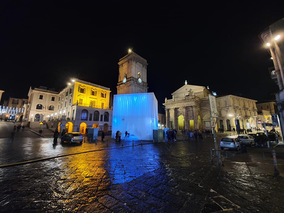 L’installazione multisensoriale, ideata dall’ingegnere-architetto Pierluigi Di Nola, rimanda al tema dell’emergenza climatica e del corretto utilizzo delle risorse ambientali. #GOON è un parallelepipedo alto 10 metri con struttura portante in alluminio che sorre teli bianchi in polietilene – la plastica da imballaggi – tagliati fino a formare un vuoto all’interno a rappresentare l’albero. Il materiale è stato appositamente prodotto da Artigian Plastic con plastica rigenerata che sarà poi riutilizzata per realizzare borse destinate a studenti e cittadini di Lanciano. L’albero-non albero è illuminato a led, all’interno ha un sistema audio che riprodurrà la voce dei ghiacciai che si sciolgono.