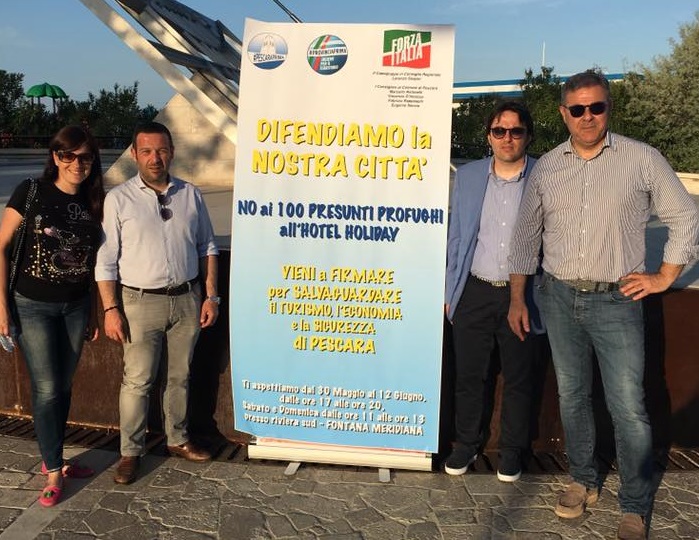 “Pescara – ha ancora ricordato Sospiri – sta pagando caro l’assenza di un sindaco. Alessandrini non esiste e non gli interessa difendere la sua città, anzi, la cosa lo annoia. E nel frattempo noi ci ritroviamo con imprenditori che stanno trasformando un albergo della riviera sud, nel cuore della zona turistica della città, in un albergo di profughi distruggendo Pescara. Da oggi cominciamo ad avvisare tutto il quartiere dello sbarco imminente accanto alle proprie abitazioni, e il nostro obiettivo finale è quello di convincere il Prefetto, che ringraziamo per la disponibilità già dimostrata nella vicenda inerente il mercato abusivo degli extracomunitari, che la localizzazione scelta per ospitare i 100 presunti profughi e’ sbagliata e il nostro e’ un ‘no’ assoluto. Questa mattina – ha quindi fatto sapere il capogruppo – effettueremo il volantinaggio serrato tra gli operatori balneari e commerciali della zona, oltre che tra i residenti, invitando tutti a venire al nostro presidio a firmare la petizione che invieremo al Prefetto, nella quale, appunto, chiediamo di cancellare il provvedimento tenendo conto della vocazione turistica della zona, dell’inizio di una stagione balneare già difficile per i problemi di contaminazione del mare, e della forte densità di popolazione nella zona. Il nostro presidio, per ora, resterà sul lungomare Cristoforo Colombo, a ridosso della Fontana La Meridiana tutti i giorni, sino al prossimo 12 giugno, dalle 17 alle 20, e la domenica anche dalle 11 alle 13, per informare il maggior numero possibile di persone, ma l’aver raccolto già 100 firme in neanche un’ora e mezza e’ il segnale del sentire comune”.