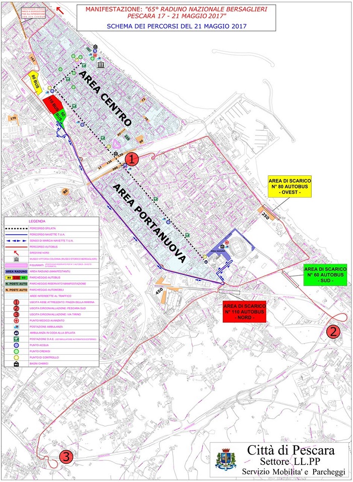 “E’ domenica mattina il momento che richiede la massima limitazione della mobilità cittadina, ma comunque con possibilità di movimento su altre direttrici – illustra il dirigente della Mobilità Giuliano Rossi –Lo sfilamento, il corteo, partirà dallo Stadio e attraverserà viale Marconi, piazza Unione, piazza Duca D’Aosta, corso Vittorio Emanuele, Corso Umberto e piazza della Rinascita: su tutte queste strade saranno vietate sosta e transito dalle 7 alle 14, per tutta la durata della manifestazione. Solo divieto di transito dalle ore 7 alle 9,30 e dalle 11,30 alle 14, ma per consentire il viavai delle navette gratuite, su: viale Pindaro, viale e ponte d’Annunzio e fino all’accesso della zona sud dell’area di risulta, su tale zona si muoveranno gli autobus di TUA che partiranno ogni due minuti. Sempre lungo questa direttrice però, dalle 9,30 alle 11,30 sarà consentito il transito delle auto che vengono da nord e dirette verso sud, per permettere al traffico di defluire (in pratica dall’area di risulta fino a viale Pindaro, passando per viale d’Annunzio). Dunque sono due le macro aree del centro e di Porta Nuova dove non si potrà transitare domenica mattina, salvo autorizzazioni ai residenti da parte delle forze dell’ordine: il centro è delimitato da Corso Vittorio, via Paolucci, via Muzii e la Riviera, ma fatta eccezione di corso Vittorio le altre vie citate sono tutte transitabili; per Porta Nuova invece il perimetro è compreso fra viale Pindaro, via d’Annunzio e via Marconi, sulle prime due andranno come detto le navette, l’ultima è interdetta a sosta e transito. L’ex via Antonelli, o meglio la strada che attraversa la Pineta, sarà chiusa come per le partite di calcio, perché destinata ai mezzi della manifestazione. Chiuse per il corteo anche le uscite dell’asse attrezzato di Piazza Unione e Piazza Italia”.