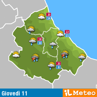 Nel Pescarese: nubi sparse con isolate piogge, temperature tra 20 e 23 gradi.