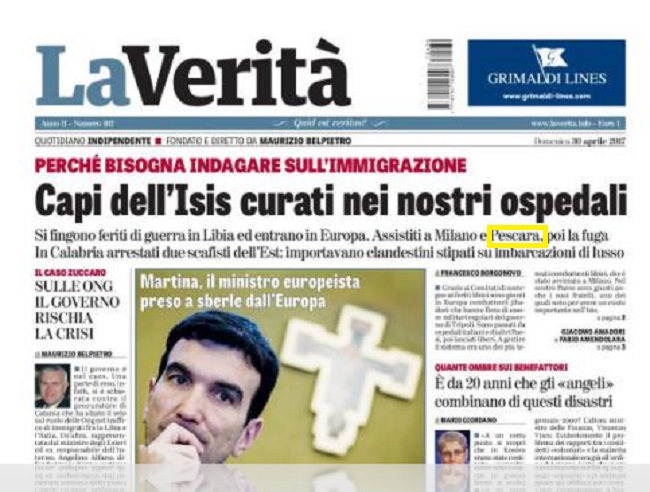 Secondo quanto riportato dal giornale di Belpietro, l’Intelligence italiana avrebbe segnalato la presenza di due personaggi di spicco dello Stato Islamico e legati al terrorismo islamico nel ultimi anni, a Pescara, grazie a un complesso quanto efficace sistema criminale che consentiva ai combattenti e ai capi dell’Isis di spostarsi in Europa fingendosi combattenti libici feriti in guerra.