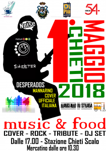A Chieti Scalo, in piazzale Marconi, dalle 17.30 avranno inizio gli eventi organizzati dall’Associazione Club 54. Musica, mercatino dell’artigianato e stand eno-gastronomici animeranno il centro urbano. Ad esibirsi saranno i Desperados, tribute band di Mannarino, gli Sheeter, cover band dei Seether, i Nasa 182, cover band del gruppo Blink 82. Dj Resident sarà Noise. Per consentire lo svolgimento della manifestazione, la Polizia municipale teatina ha istituito il divieto di sosta con rimozione su entrambi i lati di via Avezzano dalle ore 7.00 del 1° maggio alle ore 2.00 del 2 maggio; l’istituzione del divieto di transito veicolare in via Avezzano dalle ore 8.30 del 1° maggio alle ore 2.00 del 2 maggio; l’istituzione del divieto di transito veicolare e l’istituzione di sosta con rimozione dalle ore 14.00 del giorno 1° maggio alle ore 2.00 del giorno 2 maggio su entrambi i lati di via Colonnetta, nel tratto compreso tra via Scaraviglia e via De Virgiliis e l’intersezione con piazzale Marconi; in piazzale Marconi nel tratto compreso tra l’intersezione con via Colonnetta e via Avezzano e l’intersezione con viale Croce e viale Abruzzo.