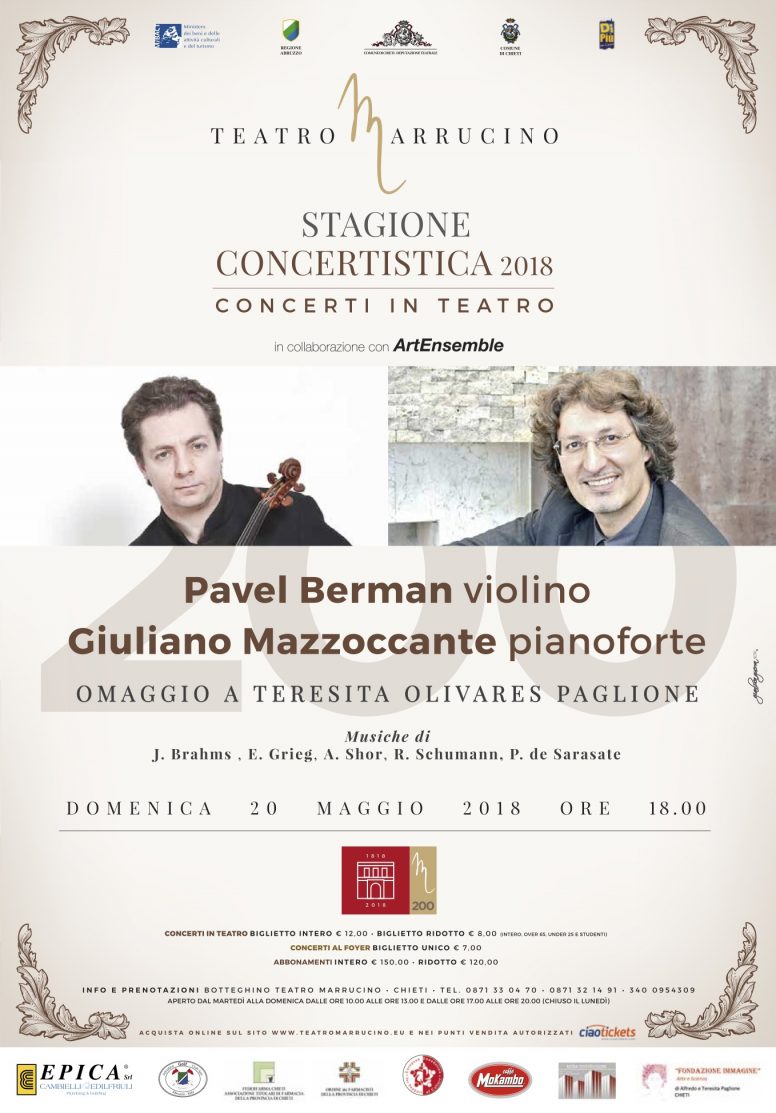 La stagione musicale del Marrucino, in occasione del bicentenario del teatro, arriva ad uno dei suoi appuntamenti più attesi: i musicisti Pavel Berman (violino) e Giuliano Mazzoccante (pianoforte) si esibiranno infatti domenica 20 maggio, con un concerto in memoria di Teresita Olivares Paglione , nel decennale della sua scomparsa : appuntamento alle ore 18, in sala grande, biglietto intero 12€ (ridotto a 8€ per studenti, under 25 e over 65). Promossa dall’associazione ArtEnsemble – di cui lo stesso Mazzoccante è direttore – l’intera programmazione conta sulla preziosa collaborazione con Epica, Adriatico Golf Club, Mokambo, Coba Costruzioni, ordine dei Farmacisti e Federfarma, Eufsc, e con la Fondazione Immagine; una relazione artistica, quest’ultima, che si fa ancora più evidente per il concerto del 20: