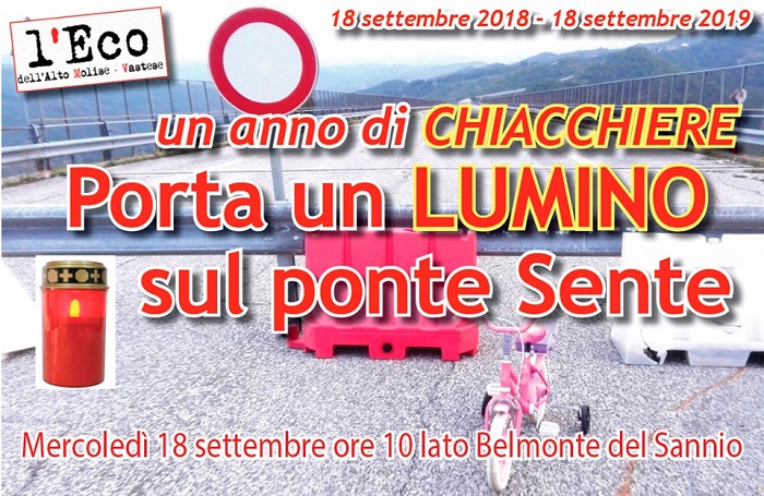 “Non una festosa candelina, ma un lugubre lumino per il primo anno di chiusura del viadotto “Sente – Longo”. A dodici mesi dal provvedimento adottato dalla Provincia di Isernia, che in pochi giorni e “senza valide alternative (la ex Istonia 86 è stata sistema solo successivamente) ha deciso di sbarrare al traffico uno dei ponti più alti in Italia, l’”Eco online” ha invitato le comunità altomolisane e altovastesi a presenziare alla “cerimonia” che si è tenuta stamani sul fronte molisano, lato Belmonte, per denunciare lo stato di forte stallo in cui versa l’iter di messa in sicurezza dell’importante infrastruttura viaria”.