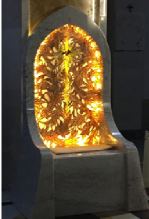 Le forme e i decori degli arredi liturgici si sono evoluti nel corso del tempo, intrecciandosi con le correnti artistiche e con le trasformazioni storiche della Chiesa, con i suoi dettami e con le sue regole. Le opere realizzate dall’ Architetto Alberto Cicerone rispondono al desiderio del Maestro di tradurre in forma il simbolismo della luce e la trasparenza del “velo della veronica”, ovvero la straordinaria immagine “Acheropita” (non fatta da mani umane), custodita dal 1638 a Manoppello. Solo dei capolavori tratti dal vetro e dal marmo avrebbero potuto inserirsi con tanta attenzione e pregnanza di significati in un contesto basilicale in cui, in uno spazio di grande rigore estetico voluto in ossequio alla regola cappuccina, al centro del presbiterio si conserva una delle reliquie fondanti della Cristianità. Quel “Volto Santo”, icona del volto espressivo di Gesù Cristo, che è meta di continui pellegrinaggi e che il Rettore, Padre Carmine Cucinelli, nel 2006 ha mostrato personalmente a Benedetto XVI, il primo pontefice della storia giunto a visitare il Santuario di Manoppello per rendere omaggio e culto all’ eccezionale reliquia della provincia pescarese.