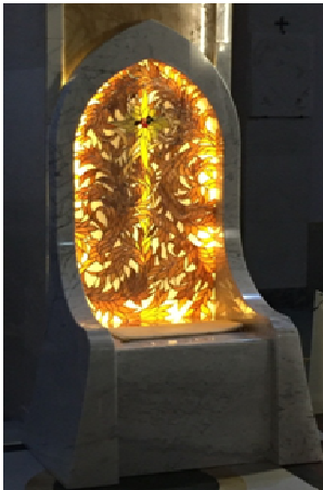 Le forme e i decori degli arredi liturgici si sono evoluti nel corso del tempo, intrecciandosi con le correnti artistiche e con le trasformazioni storiche della Chiesa, con i suoi dettami e con le sue regole. Le opere realizzate dall’ Architetto Alberto Cicerone rispondono al desiderio del Maestro di tradurre in forma il simbolismo della luce e la trasparenza del “velo della veronica”, ovvero la straordinaria immagine “Acheropita” (non fatta da mani umane), custodita dal 1638 a Manoppello. Solo dei capolavori tratti dal vetro e dal marmo avrebbero potuto inserirsi con tanta attenzione e pregnanza di significati in un contesto basilicale in cui, in uno spazio di grande rigore estetico voluto in ossequio alla regola cappuccina, al centro del presbiterio si conserva una delle reliquie fondanti della Cristianità. Quel “Volto Santo”, icona del volto espressivo di Gesù Cristo, che è meta di continui pellegrinaggi e che il Rettore, Padre Carmine Cucinelli, nel 2006 ha mostrato personalmente a Benedetto XVI, il primo pontefice della storia giunto a visitare il Santuario di Manoppello per rendere omaggio e culto all’ eccezionale reliquia della provincia pescarese.