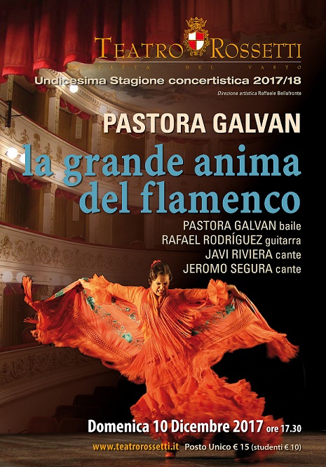 Vasto, il grande flamenco al Teatro Rossetti. La celebre bailaora PASTORA GALVAN assieme a Rafaele Rodriguez –guitara, Javi Riviera – cante, e Jeromo Segura – cante e palmas, calcheranno il palco del Teatro Rossetti di Vasto.