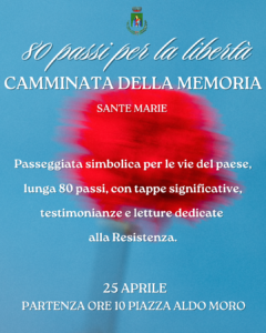 Sante Marie celebra l’80esimo anniversario della Liberazione con una camminata della memoria, una marcia collettiva per ripercorrere gli eventi e ricordare le persone che hanno segnato la storia della libertà italiana. L’evento prende il via alle 10 da piazza Aldo Moro e si snoda attraverso otto tappe significative del centro abitato. Itinerario fino alla Fonte a Monte, poi ritorno verso il centro attraverso via Roma e corso Garibaldi. Arrivo davanti al monumento ai caduti. In ciascuna delle otto soste previste verranno letti brevi testi – testimonianze, lettere, poesie o brani storici – per dare voce alla memoria e promuovere una riflessione collettiva sui valori della Resistenza e della libertà. Al termine della passeggiata la piantumazione dell’albero della memoria davanti al monumento ai caduti.