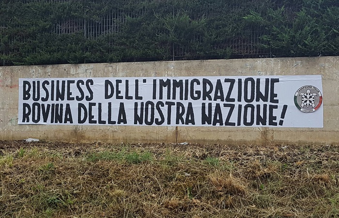 “Business dell’immigrazione rovina della nostra nazione”, il testo dello striscione affisso in nottata da CasaPound sulla questione dei profughi espulsi da centro accoglienza di Torino di Sangro e che ora dimorano nei giardini pubblici di Lanciano.