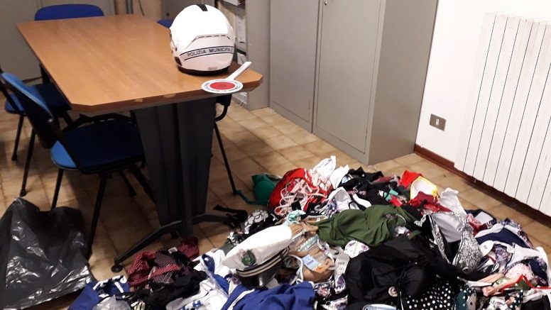 Lotta al commercio abusivo: sulle spiagge di Montesilvano la polizia municipale ha sequestrato oltre 300 capi di abbigliamento e un ciclocarretto per la vendita di granite.