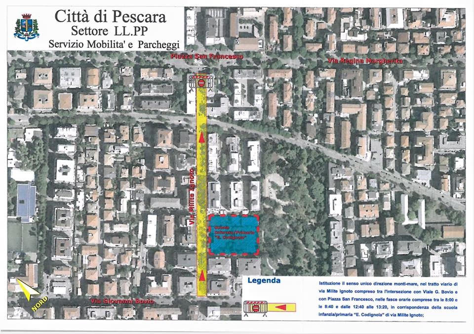 - l’istituzione del senso unico direzione monti-mare, nel tratto viario di via Milite Ignoto compreso tra l’intersezione con Viale G. Bovio e con Piazza San Francesco, nelle fasce orarie comprese tra le 8:00 e le 8:40 e dalle 12:40 alle 13:20, per permettere un ordinato scorrimento del traffico in corrispondenza della scuola infanzia/primaria “E. Codignola” di via Milite Ignoto;