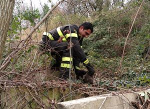 La segnalazione è arrivata da un’addetta del canile di Carapollo, circa la presenza di una cucciolata, partorita in un profondo canale di scolo. Il punto di ingresso del canale era difficilmente accessibile, a causa della presenza nella zona di fitti cespugli e rovi. Un vigile del fuoco si è introdotto all’interno del canale, per circa 10 metri, facendosi largo tra la vegetazione presente all’interno dello stesso, fino a raggiungere la cucciolata composta da 9 animali di futura taglia grande.
