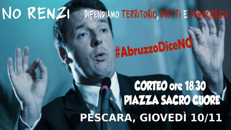 Il Presidente del Consiglio sarà a Pescara, si legge in un documento delle tante associazioni e dei partiti aderenti da tutta la regione, per portare avanti la sua campagna referendaria ed il Presidente D’Alfonso, per accreditarsi, ha organizzato una serie di eventi “istituzionali” per tutta la giornata dove il premier possa raccogliere applausi e fare propaganda. Se chi governa l’Abruzzo applaude il premier, sentiamo il dovere, come cittadine e cittadini che si battono per la difesa del nostro territorio, di esprimere il nostro NO, si legge sempre nel documento. E stamani sulla questione sono intervenuti i rappresentanti del Fronte per il No. Tra questi l’ex parlamentare di Rifondazione Comunista Maurizio Acerbo, il quale ha sottolineato che lo scopo della manifestazione di domani è quello di dare voce ai tanti no alle proposte ed alle politiche del Governo Renzi. .