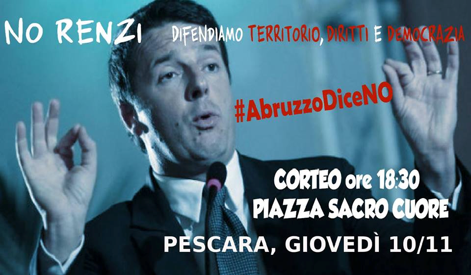 Il Presidente del Consiglio sarà a Pescara, si legge in un documento delle tante associazioni e dei partiti aderenti da tutta la regione, per portare avanti la sua campagna referendaria ed il Presidente D’Alfonso, per accreditarsi, ha organizzato una serie di eventi “istituzionali” per tutta la giornata dove il premier possa raccogliere applausi e fare propaganda. Se chi governa l’Abruzzo applaude il premier, sentiamo il dovere, come cittadine e cittadini che si battono per la difesa del nostro territorio, di esprimere il nostro NO, si legge sempre nel documento. E stamani sulla questione sono intervenuti i rappresentanti del Fronte per il No. Tra questi l’ex parlamentare di Rifondazione Comunista Maurizio Acerbo, il quale ha sottolineato che lo scopo della manifestazione di domani è quello di dare voce ai tanti no alle proposte ed alle politiche del Governo Renzi. .